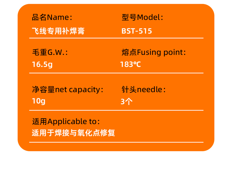 ▶ 产品名称: 飞线专用补焊膏▶ 产品型号: BST-515▶ 产品类别: 锡浆焊油系列▶ 产品容量: 5毫升▶ 产品净重: 10g▶ 产品毛重: 16.5g