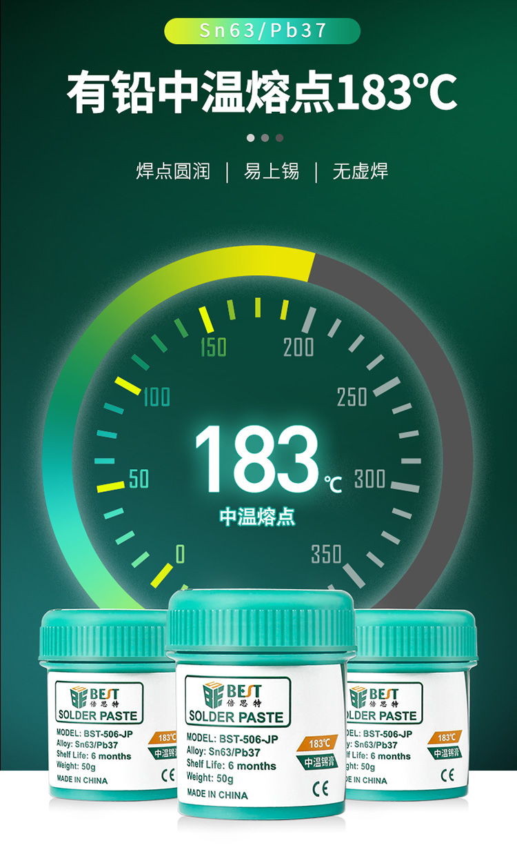 ▶ 产品名称: 中温锡浆 BGA植锡膏▶ 产品型号: BST-506-JP▶ 产品类别: 锡浆焊油系列▶ 产品成分: Sn63/Pb37▶ 产品重量: 50g