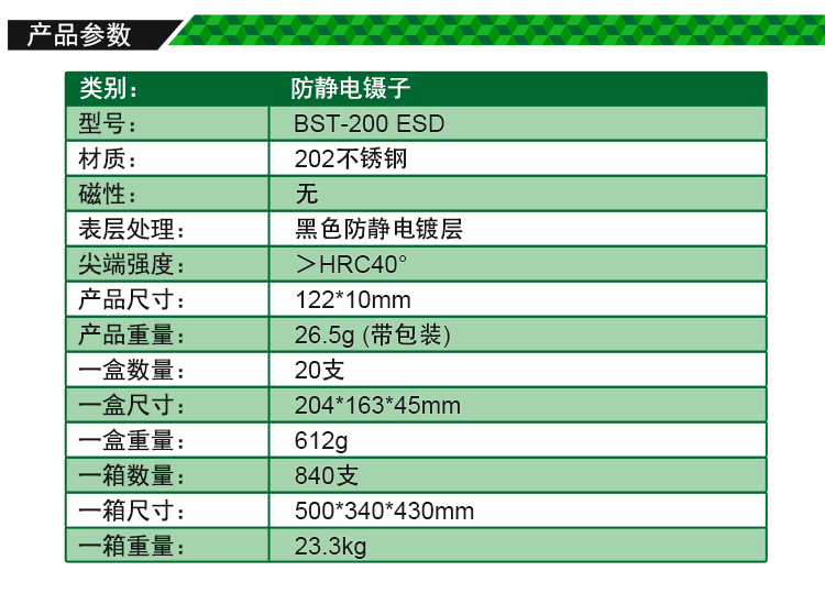 ▶ 产品名称: 优质钢化防静电镊子▶ 产品型号: BST-200ESD▶ 产品类别: 镊子系列