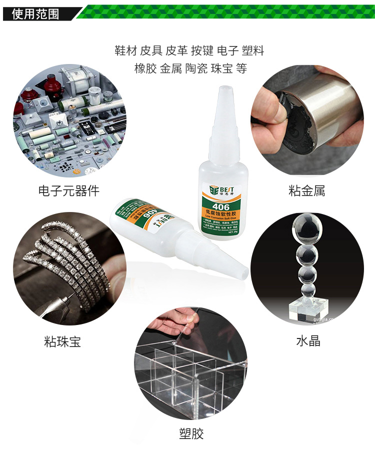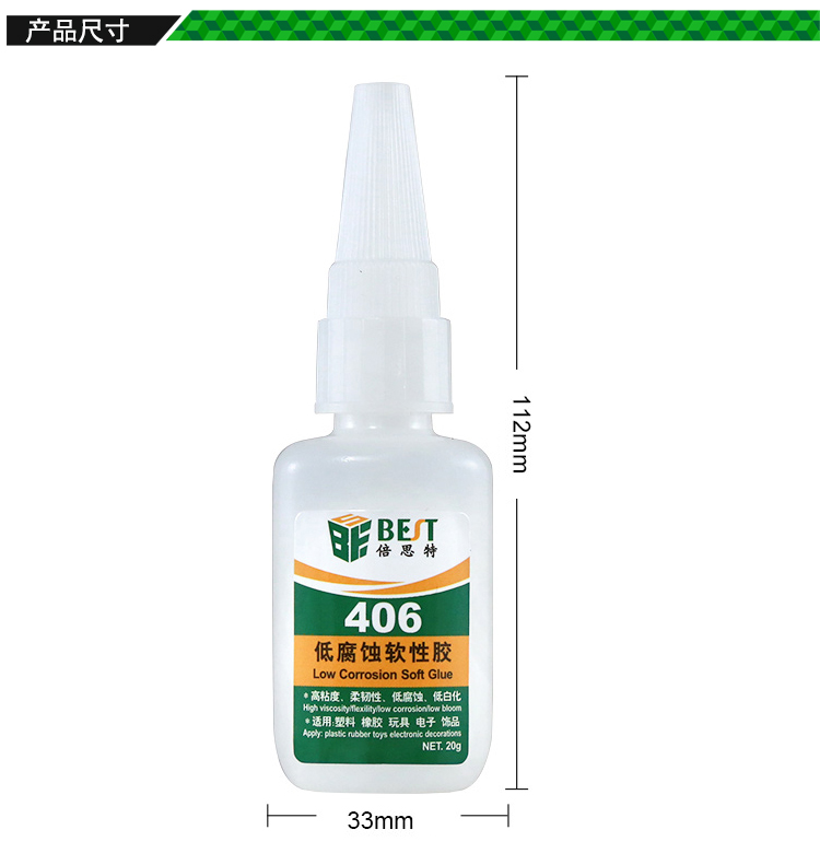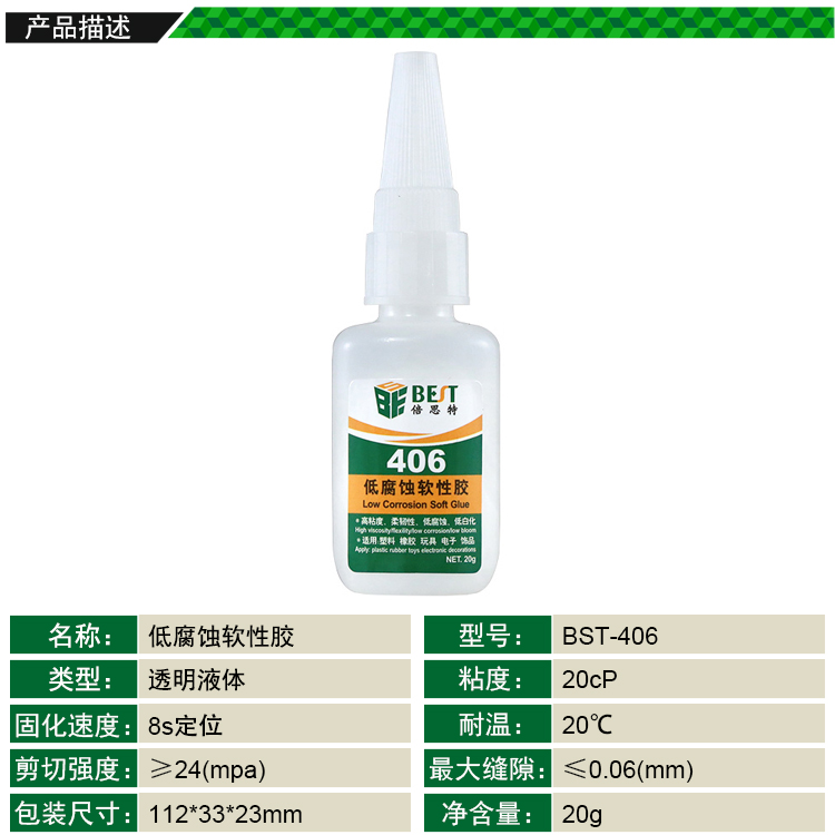 ▶ 产品名称: 低腐蚀软性胶 瞬间胶▶ 产品型号: BST-406▶ 产品类别: 胶水胶纸系列