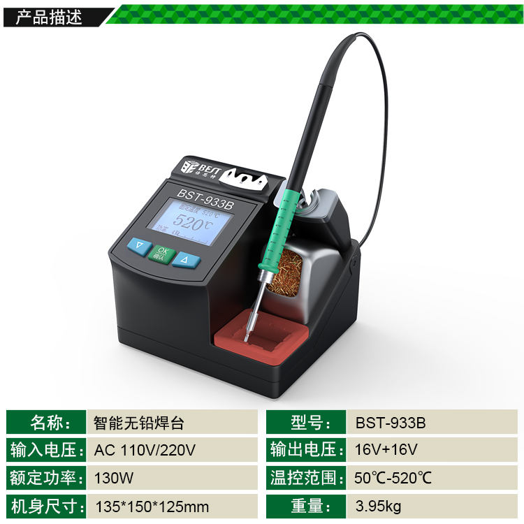 ▶ 产品名称: 智能无铅焊台▶ 产品型号: BST-933B▶ 产品类别: 焊台系列