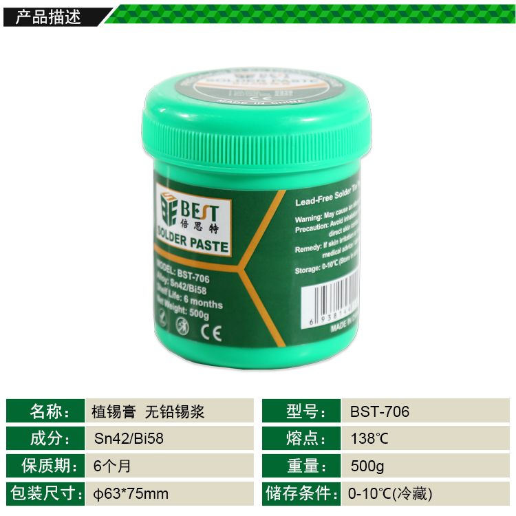 ▶ 产品名称: 无铅锡浆 焊锡膏 BGA植锡膏 500g▶ 产品型号: BST-706▶ 产品类别: 锡浆焊油系列▶ 产品成分: Sn42/Bi58▶ 产品重量: 500g